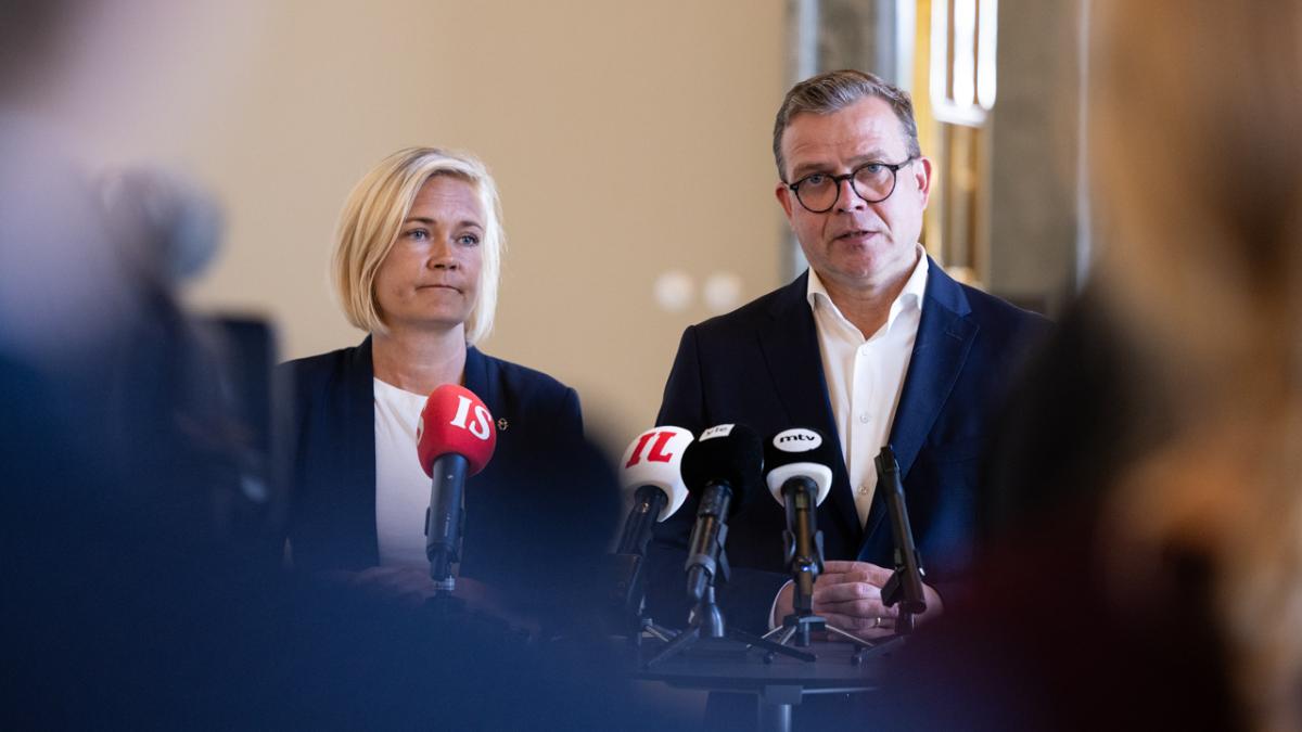 Pääministeri Petteri Orpo ja sisäministeri Mari Rantanen kertoivat rajaturvallisuuslaista perjantaina eduskunnan Valtiosalissa järjestetyssä mediatapaamisessa.