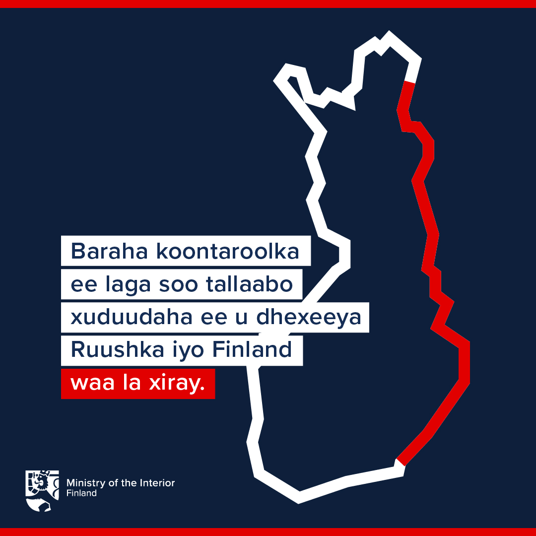 Finland kama soo geli kartid xadka u dhexeeya Ruushka iyo Finland. Baraha xad ka soo tallaabista ee xudduudka bari waa la xiray. Magangalyo kama codsan kartid ama iskama dhiibi kartid xuduudka bari ee Finland. Ha imaanin xuduudka.