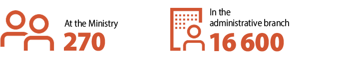 Most of the ministry employees work in various specialist roles related to law drafting, internal security, migration, finances and administration. 14 per cent work in secretarial and support roles.