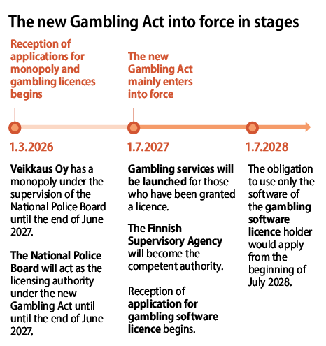 Gambling companies can apply for licences from the National Police Board starting 1 March 2026 and the provision of licensed gambling services can begin on 1 July 2027. The licensing and supervision duties under the Gambling Act will be carried out by the Finnish Supervisory Authority as of 1 July 2027.