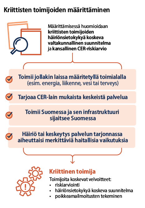 Eri toimialoista vastaavilla ministeriöillä on keskeinen rooli kriittisten toimijoiden määrittämisessä. Kriittisten toimijoiden määrittäminen perustuu CER-lakiin ja EU-komission antamiin tarkentaviin ohjeisiin. Määrittämisessä huomioidaan valtakunnallinen suunnitelma ja kansallinen CER-riskiarvio.