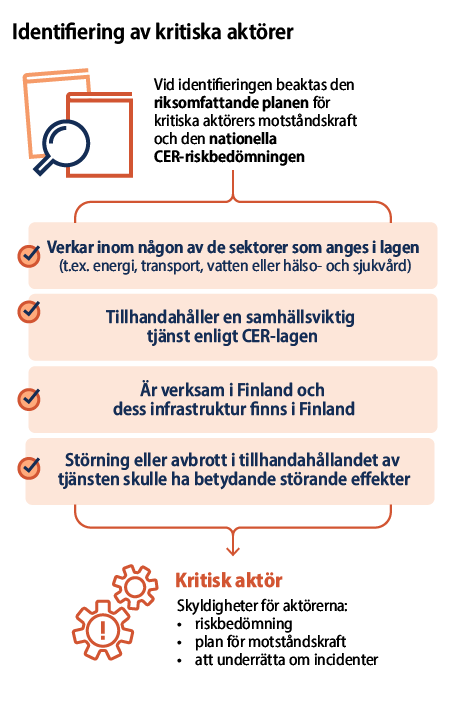 Ministerierna, som ansvarar för de olika sektorerna, har en central roll när det gäller att identifiera kritiska aktörer. Identifieringen av kritiska aktörer grundar sig på CER-lagen och Europeiska kommissionens preciserande riktlinjer. Vid identifieringen beaktas den riksomfattande planen och den nationella CER-riskbedömningen. Ministerierna måste fatta beslut om kritiska aktörer för första gången senast den 17 juli 2026. Beslutet är i kraft högst fyra år.