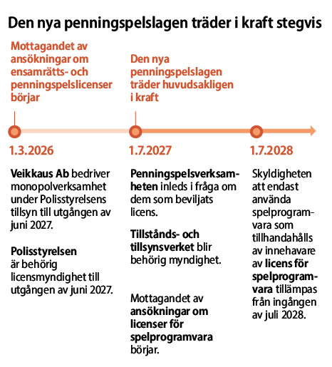 Penningspelsbolagen kan ansöka om licenser hos Polisstyrelsen från och med den 1 mars 2026, och den licenspliktiga penningspelsverksamheten kan inledas 1 juli 2027. Tillstånds- och tillsynsuppgifter enligt penningspelslagen ska skötas av Tillstånds- och tillsynsverket från och med den 1 juli 2027.